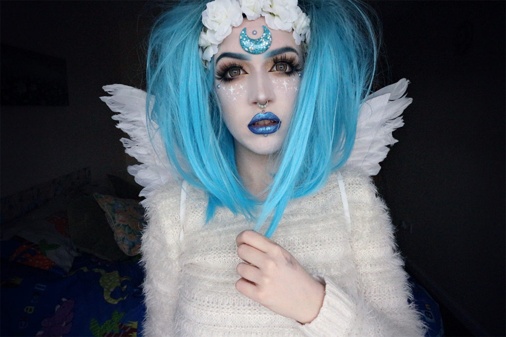 When I received (it was fast!) the wig I was a bit disappointed by the color, which isn’t an electric blue at all, more like some kind of mint blue. It isn’t that bad, but the wig in itself is reaaaally shiny. Not too much, but more shiny than the Blue Moon for example. Also, the fibers fall way more easily, without even brushing the wig. I like it ’cause it’s soft and the shape is pretty but I’m not gonna buy that kind of wig on that site, sorry Lush Wigs! I will stick to the Blue Moon :p