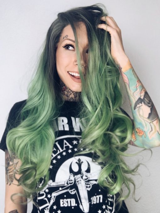 Pastel green lace front wig. Jaded is an unusual shade that just works. An emerald green muted colour with subtle dark undertones with black overgrown roots, give a natural feel to this curly mane.