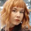 This bob is a mix of coral and light blonde tones that deliver a beautiful natural ginger hue. With a creamy peach dip dye effect on the ends. The style carries a defined wave that falls just above the shoulders, with a sleek blunt fringe.
