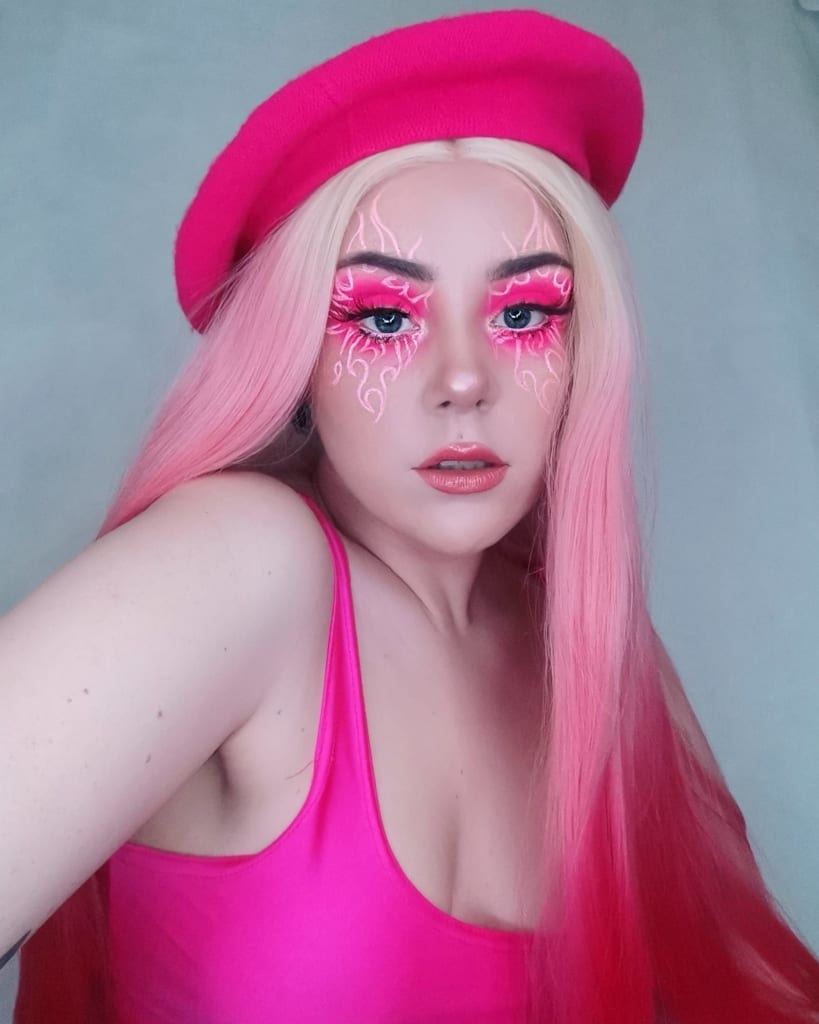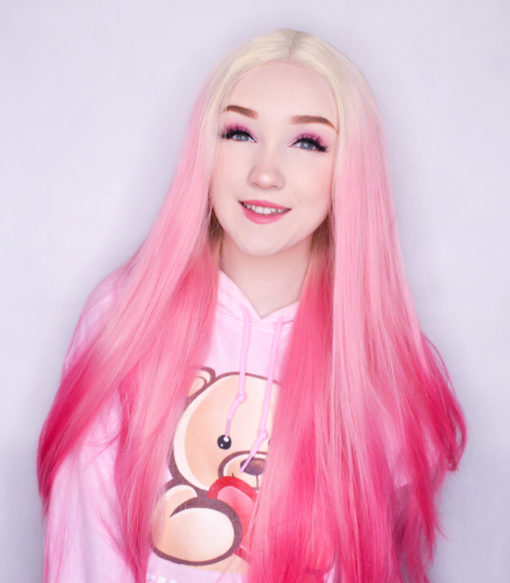 Blonde and pink straight long lace front wig. Lollipop is a firm fav! This sweet and dreamy ombre. A natural twist of blonde roots that melt into a dusky pink then a deep pink dip dye.