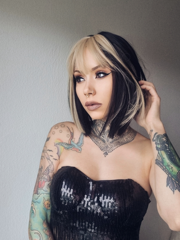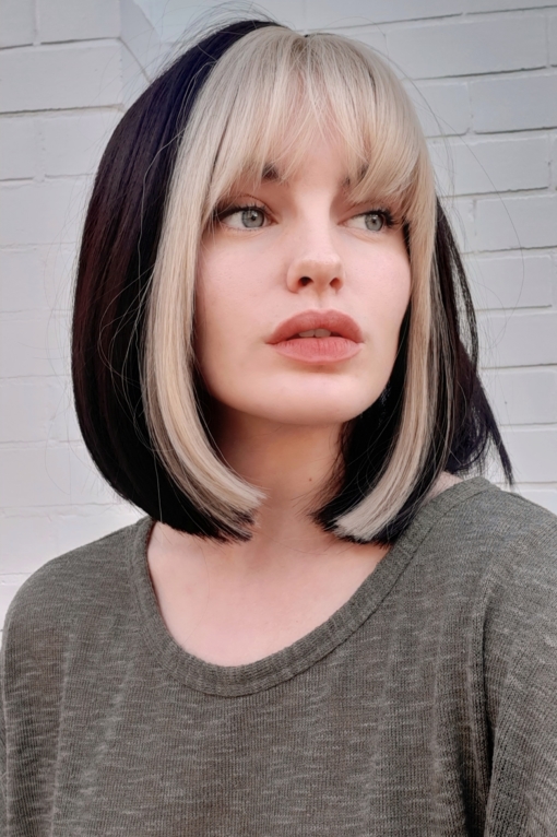 This straight bob that curls under at the ends. Comes with a bold money-piece face framing highlight of blonde. The rest of the hair is a dark brown colour. The sleek blunt fringe carries the blonde colour.