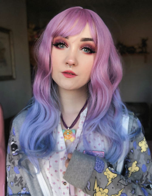 Bluebell nails it, a perfect blend of pastel pink from the roots, melting into a pale blue ombre. Delicate waves and a wispy fringe.