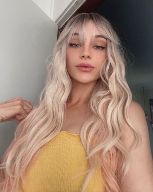 natural looking honey blonde, peach wavy extra long length wig with bangs