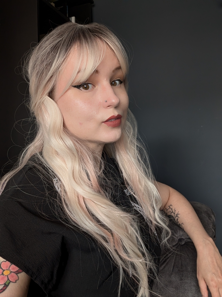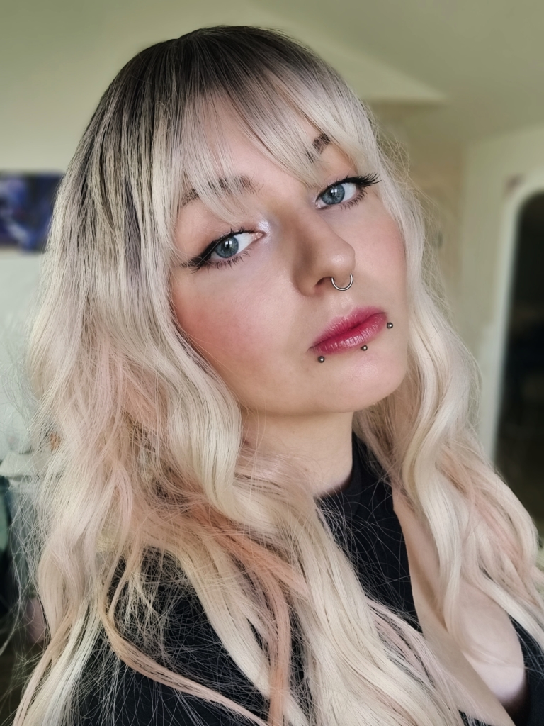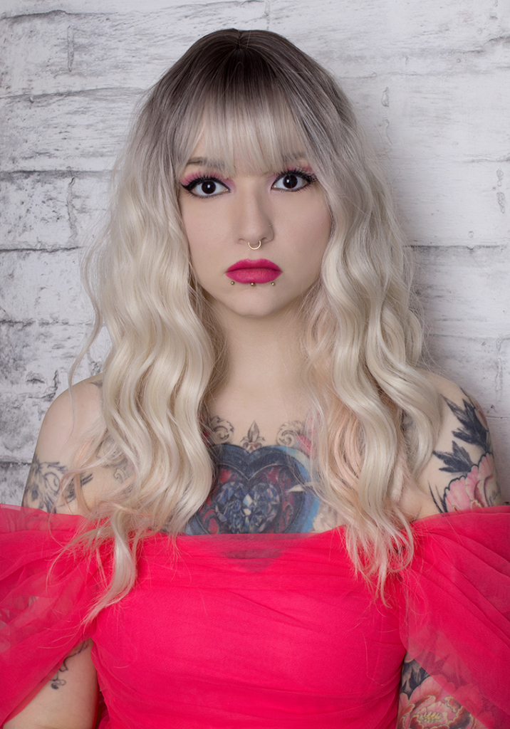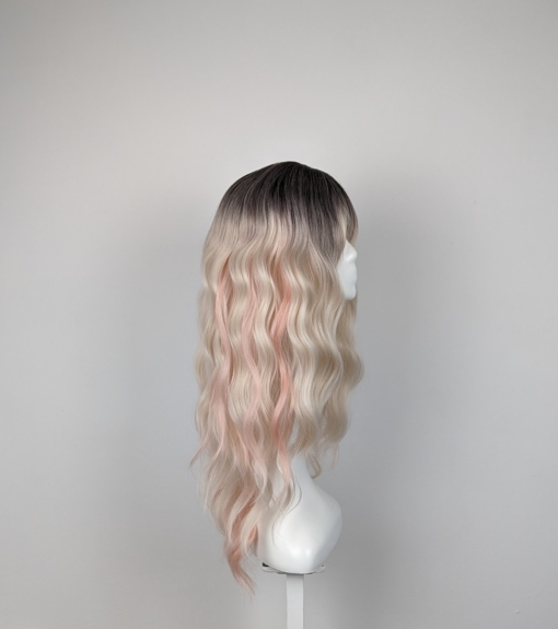 Dark brown shadowed roots melt into a light blonde with subtle pastel peach and pink strands for that peek-a-boo effect. Long loose waves with long invisible layers adds movement and body. A light sleek fringe frames the face.