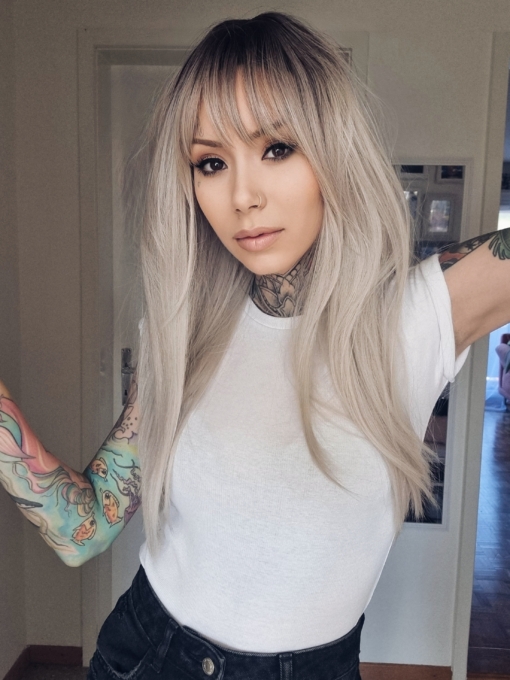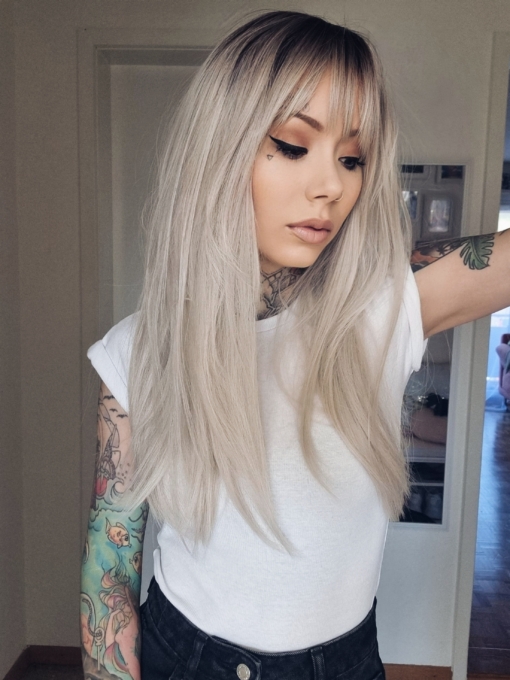 Dark brown shadowed roots blend into a sterling blonde colour. Cut into long straight layers to add fullness and movement. A blunt sleek fringe finishes the look.