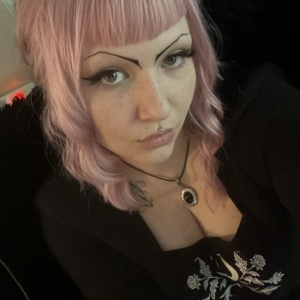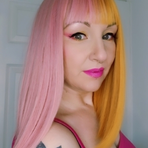 This wavy bob comes to life with a face framing slice of bright purple colour. Thats carried into the sleek fringe and adds a peek-a-boo at the sides. A soft black colour from roots to tips.