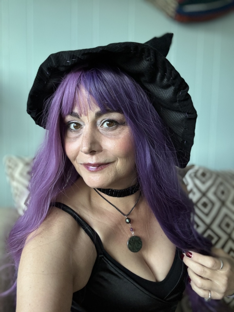 This two tone split colour wig has one half violet and on the other side a muted purple. The sleek blunt fringe carries the colours seamlessly. Styled into loose barrel curls with plenty of volume.