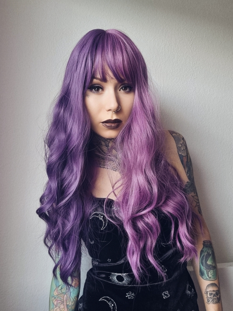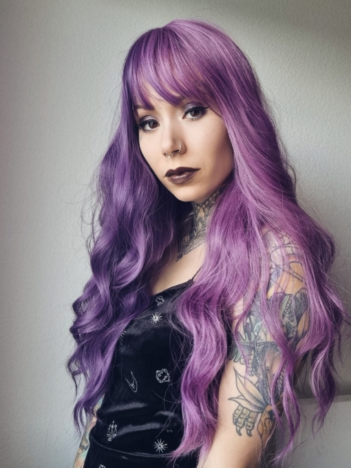 split colour, multi-colour, violet, purple wavy extra long length wig with bangs