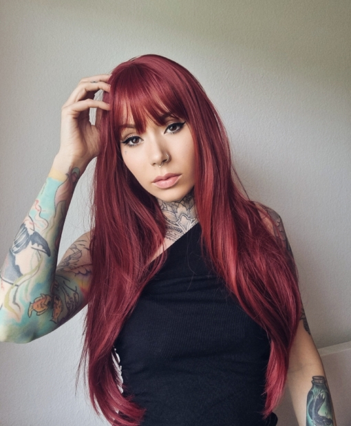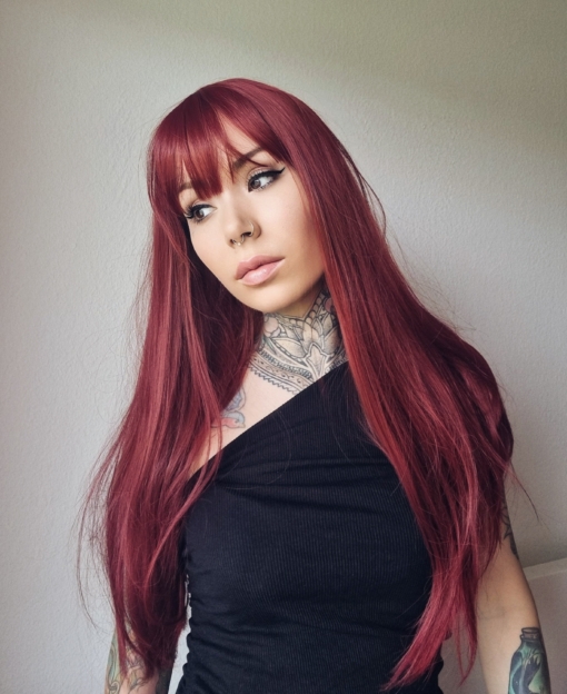 This sleek style comes in dark red wine colour from roots to tips. Cut into long layers that fall to the waist. Finished in a barrel brush blow out, with a blunt fringe.