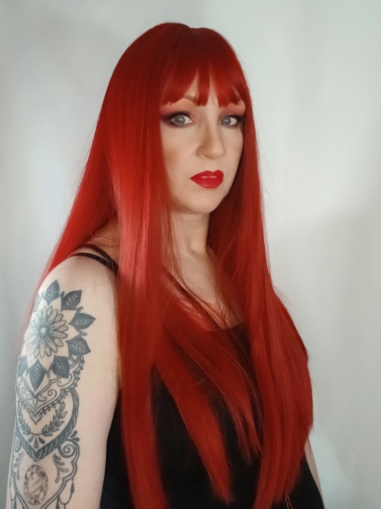 A rich, jewel toned ruby red from the roots to tips. The cut is long with invisible layers and dead straight with a full blunt fringe.