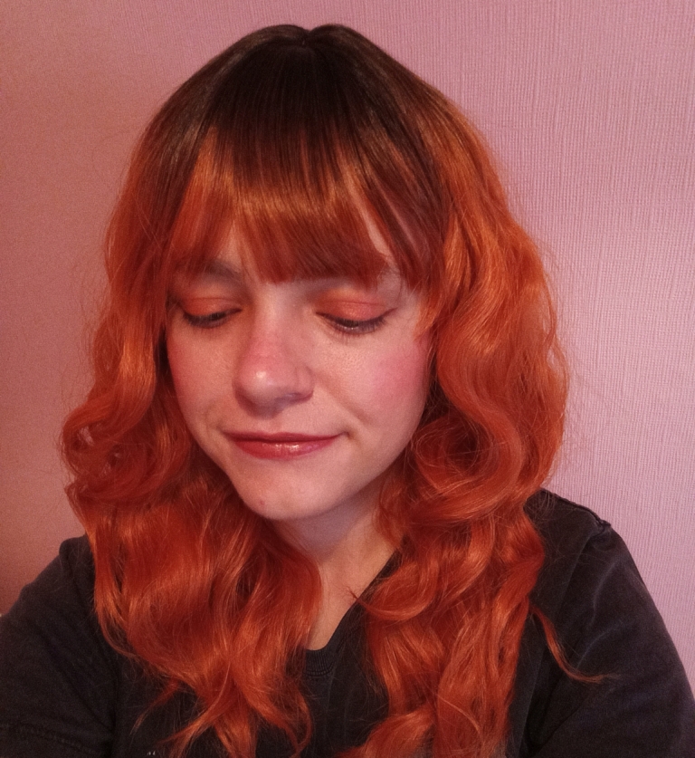 A bright and vibrant tangerine orange wig with brown shadowed roots. Styled with loose waves and a sleek blunt light fringe.