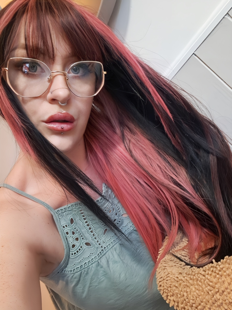 This wig is cut into face framing layers with a sleek blunt fringe. A long style with a slice of dark pink at the front. Mixed in with a natural warm black tone to the rest of the head. A block of pink colour from the nape of the neck gives a peek-a-boo effect.