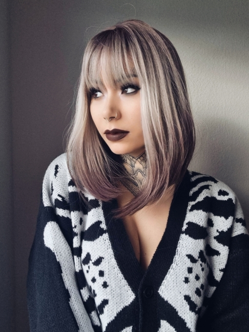 A sleek natural long bob (lob) with a light fringe. Carries dark brown shadowed roots that blend into this ash blonde colour. Finished off with a block of chocolate brown at the tips.