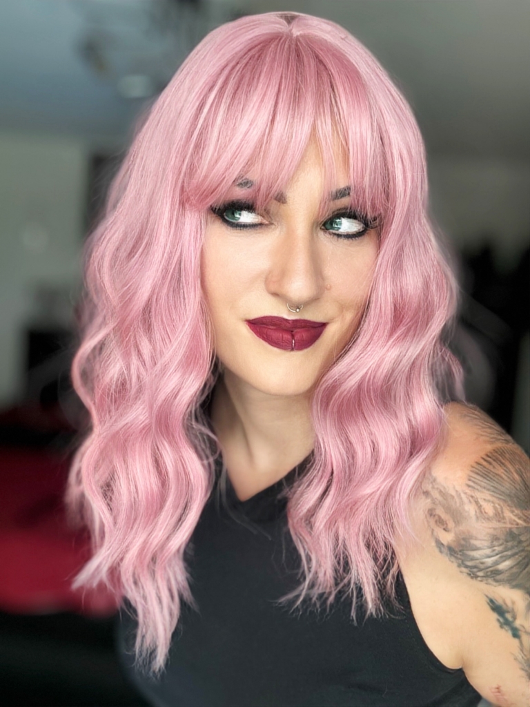 A baby pink and light blonde colour mix make this pastel hue from roots to tips. A long bob styled into a loose wave with a sleek blunt fringe.
