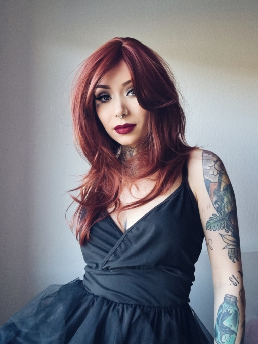 Long and sleek with layers for movement. A muted auburn and ginger colour creates this beautiful hue from roots to tips. A long fringe frames the face and can be worn as long curtin bangs.