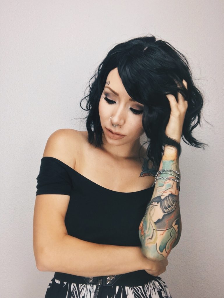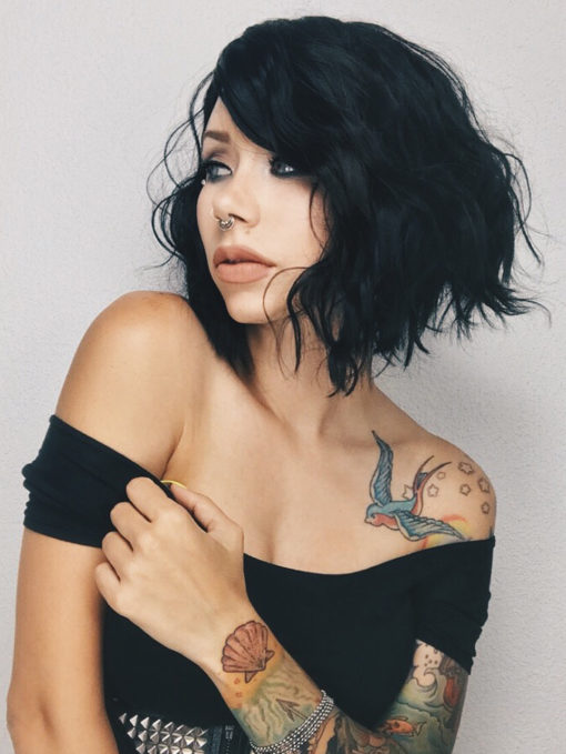 Black Tea is a natural one length bob styled in tousled waves that give plenty of volume and texture. Black from roots to tips with a blunt fringe.