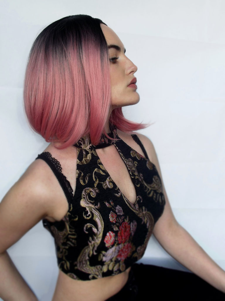 Rose pink straight bob with dark roots. XOXO takes pink hair to the next level with black shadowed roots that blend into a rose hue. As a classic chic bob, we can’t get enough of it!