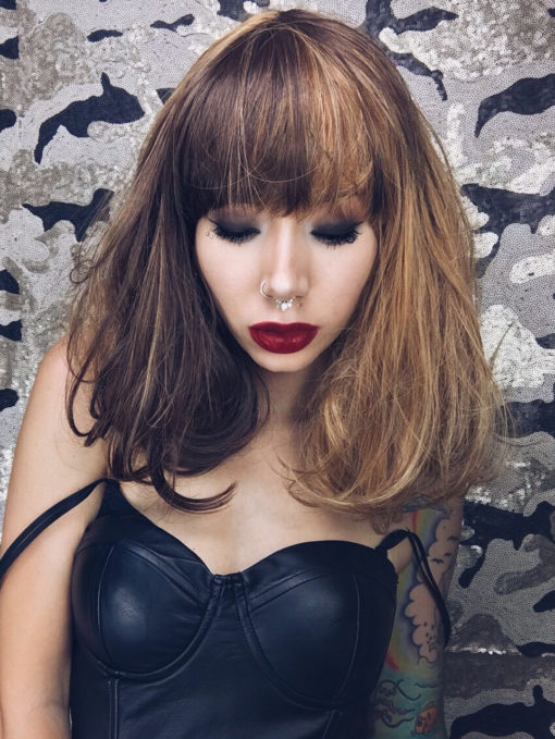 A honey blonde hue from roots to tips, with a slice of light brown to add definition. We love this natural fragment look. This is for you if you don’t want a full 50//50 split style. Straight and thick with a curl under at the ends.