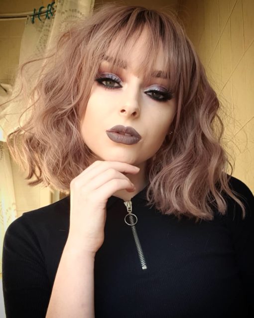 light purple wavy short length bob wig with bangs