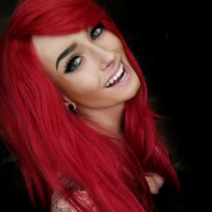 Red Alert! Cherry Lipgloss is a bright cherry red colour from roots to tips. Its long and sleek with long layers styled in a blow out for body and movement. The fringe is long and thick, adding extra layers to the face.