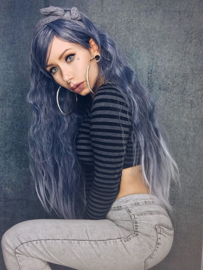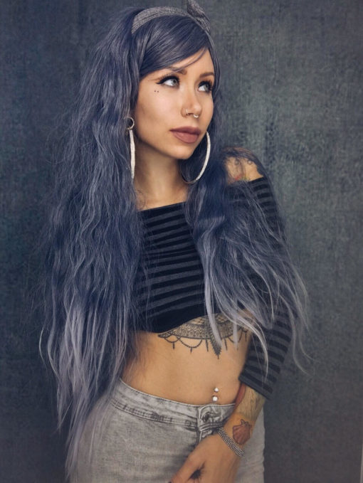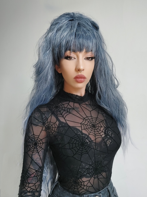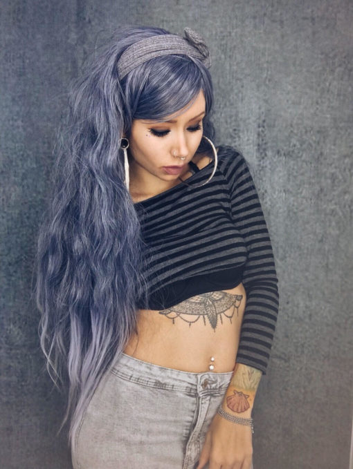 Grim Fairytale is a big, fluffy crimped style with a long thick fringe. We love the blue steel shade from the roots, melting into a washed out greyish dip dye on the ends. The lengths fall to the hips, lots of hair to style and dress.