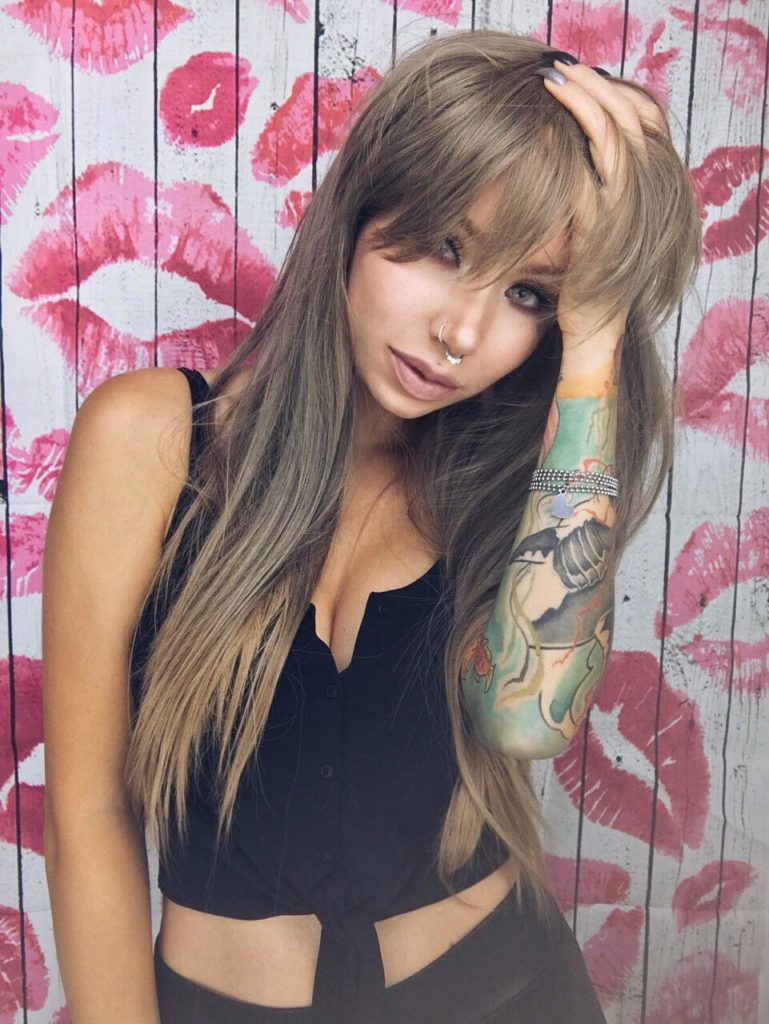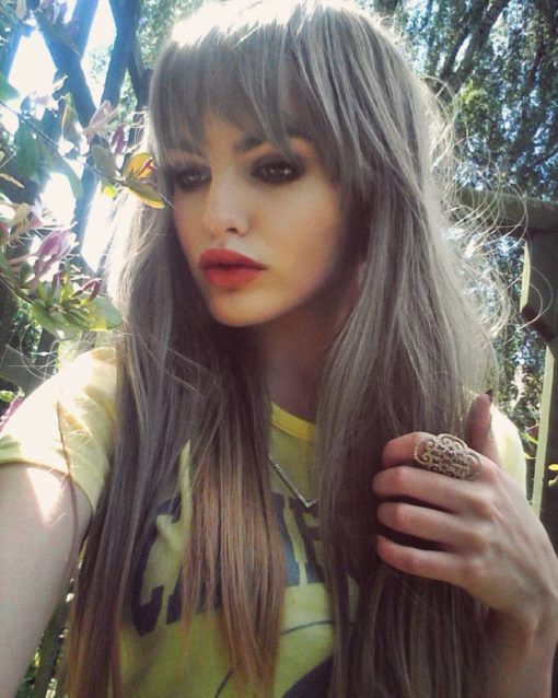 This wig has a mixture of sandy blonde and grey lowlights from the roots to ash blonde dip dye tips. Styled sleek with long layers falling to the waist. The fringe is long and sleek.