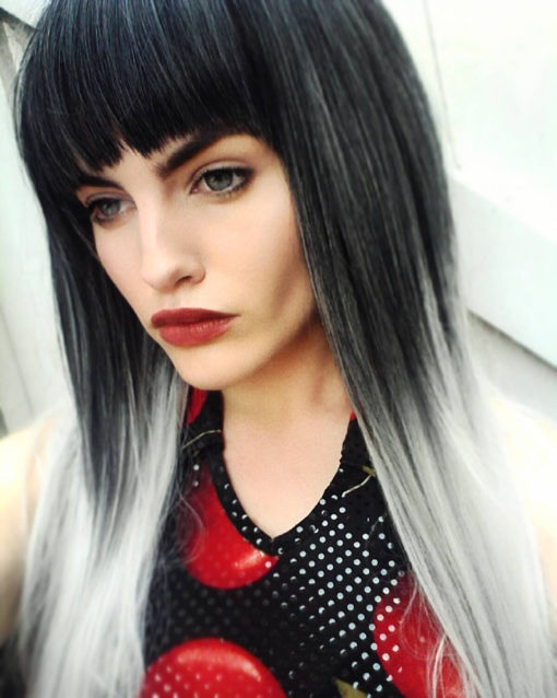 Black and silver long ombre wig with bangs. Silver ombre is a dazzling combination of dark and light. Its cool black roots with undertones of sliver and purple flow to the jawline that blends into silver hues.