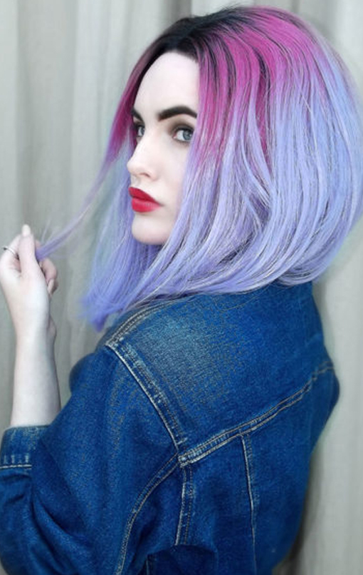 Saturn is a cosmic play of vibrant hues. With a natural twist of warm black shadowed roots, that fade into a block of muted rose pink, then into a blue lilac ombre colour.