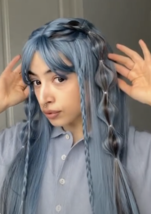 Bluejay has been styled into a dutch and bubble braid, loving how this shows the black streaks in the hair.