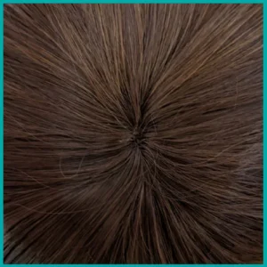 Closure top wigs are finished with a top piece that forms a circular crown.