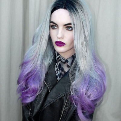 Saturn is a lace front, styled into a thick graduated bob. Black roots fade to a washed-out bright pink, which melts into a gorgeous lilac. The bob starts at just above shoulder-length and comes in longer at the front (around the collar bone). A glamorous style with a grungy edge!
